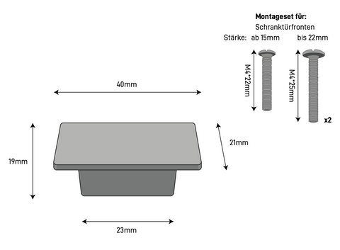 Pro Griff liegen zwei Schraube M4x25 sowie zwei M4x22 bei, welche je nach Tiefe der Front selbst gewählt werden können. Für die Wandmontage sind passende Schrauben mit Dübel enthalten.